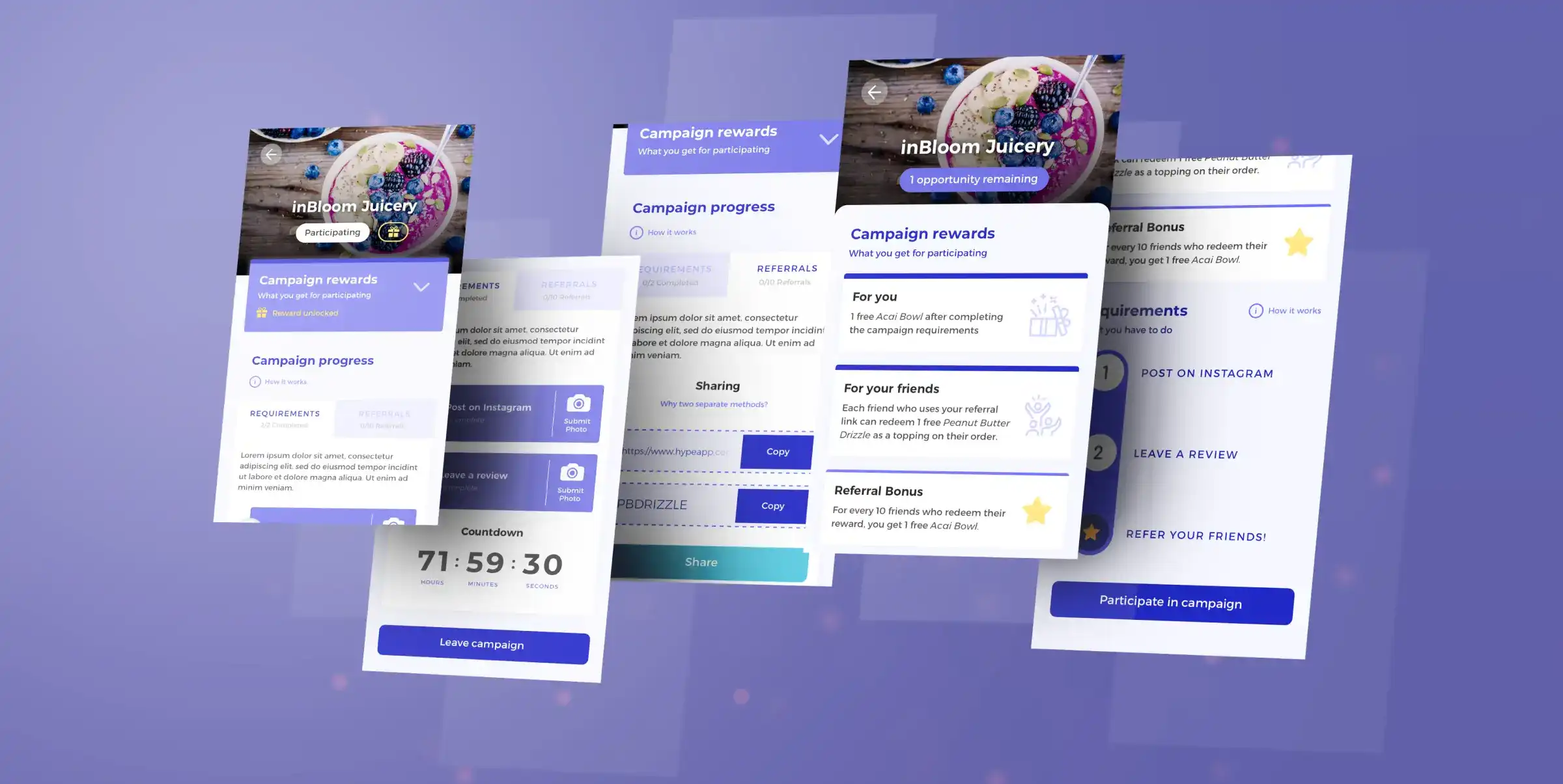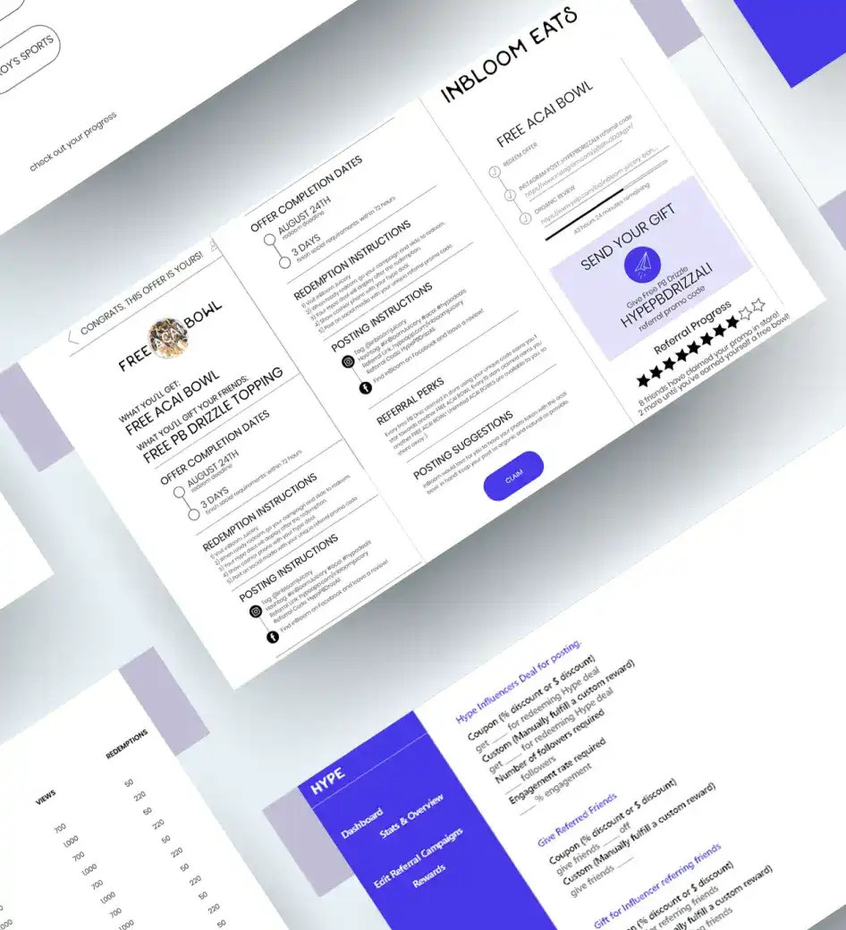 Initial mockups visualized a model that would allow influencers to partner up with local businesses. Influencers would take pictures of products and connect them to social media posts, thus contributing to local marketing campaigns. As incentive, the influencer would get a complimentary product as well as a unique promo code to share with followers. More followers using the promo code would mean additional rewards for the influencer.